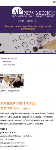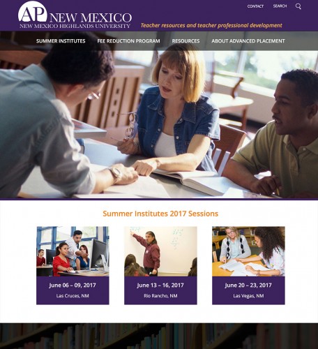 The Advanced Placement (AP) Program is a national nonprofit educational association of colleges, universities and high schools. The AP NM website is a resource for educators who take part in summer institutes in New Mexico to monitor introductory-level college curricula and then design courses, materials, and professional development to deliver the curricula in middle schools and high schools. Teachers register for the programs online. The website has admin tools for downloading program rosters and managing participant info.