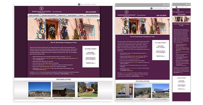 The Berkshire Hathaway HomeServices Taos Real Estate website uses custom property search and display, with large size image galleries. Users can also search the MLS online at the website to find all Taos, NM real estate listing information and contact the brokers directly. The website includes a wealth of online resources and the latest news about  buying and selling properties and homes in northern New Mexico.