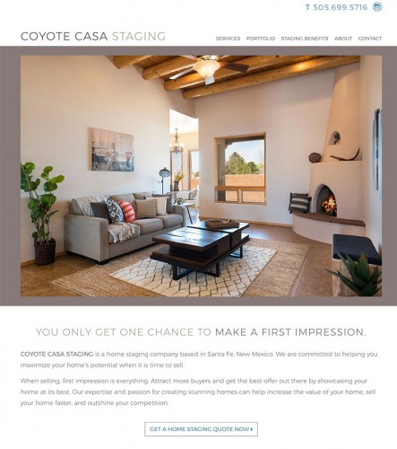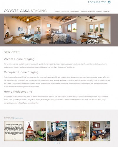 Coyote Casa Staging is a home staging and redecorating service in Santa Fe. Desert Elements designed the small business website to highlight how a home can attract more buyers when its full potential is on display. The interior design website features an Instagram feed, large image slideshow, interactive before and after images in a robust portfolio, and a quick online quote form for potential clients to make contact at any time.