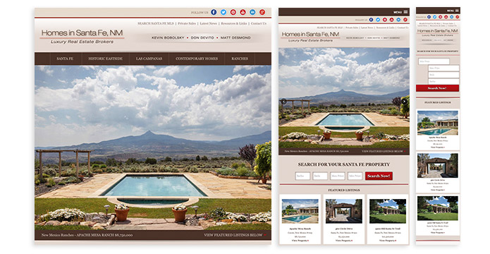The Homes in Santa Fe real estate website uses custom property search and display, with full size image galleries. Users can also search the MLS online at the website to find all Santa Fe, NM real estate listing information and contact the brokers directly. The website uses full screen images and includes a blog about the latest news in New Mexico homes for sale.