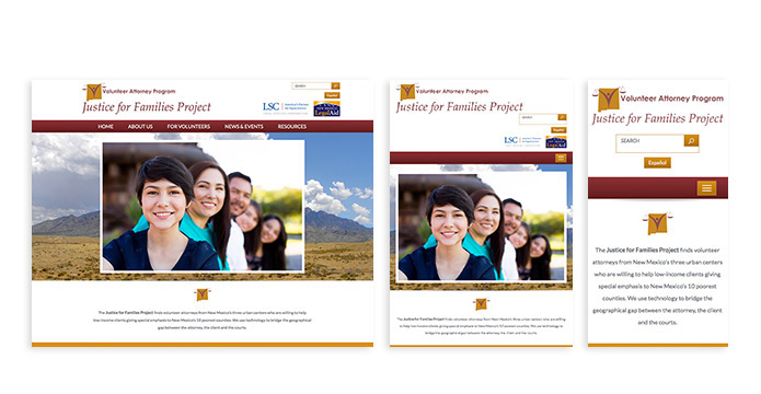 The Justice for Families Project coordinates volunteer attorneys for low income clients. Desert Elements' bilingual website design for the New Mexico non-profit organization aims to recruit volunteers and to provide information and online resources in English and Spanish for working with pro bono clients. The interactive web features include an online application to volunteer and a password-protected section for participants. Website visitors can donate online, use the website search, and connect to the organization on social media.