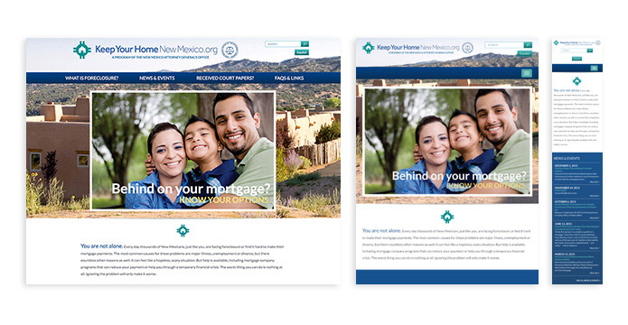 The website for the non-profit organization Keep Your Home New Mexico provides information on the partnerships between New Mexico state agencies and local nonprofit organizations that assist New Mexico homeowners facing foreclosure. The website design is mobile-friendly. A Spanish language website version makes the content available to Spanish-speaking website visitors.