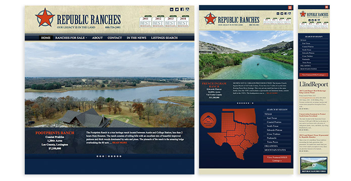 The Republic Ranches real estate website is a WordPress website with a custom design and custom development by Desert Elements. The site features exclusive land and ranch property for sale in Texas and other states. The website provides news, a real estate search, and details on the real estate agents who work for the company.