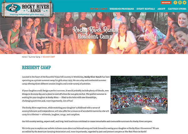 The Rocky River Ranch website features images of fun and learning for kids who attend summer camp in Wimberly, Texas. The site also provides information on event rentals and other programs at the ranch. The responsive design is engaging and bright while keeping with the western theme through fonts and other graphic elements. The site links to online registration and a camp store with a custom wrapper theme. The website CMS allows ranch staff to update text, images, and even the countdown to camp on the homepage.