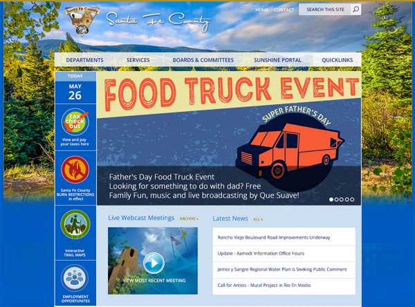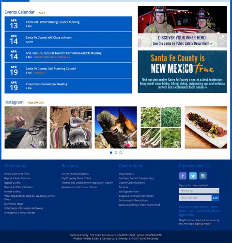 The Santa Fe County website was designed and programmed by Desert Elements first in 2007. Desert Elements has updated the design, features and functionality over time to keep the site updated and user friendly for a wide range of users and multiple target audiences. The local government website features an archive of news and announcements, webcasts of meetings, a robust calendar of events, committee meeting documents, packets, and agendas, video on demand, a sitewide search tool, and an online job posting and job application module. The website CRM (constituant relationship management) tool offers residents the ability to interact and conduct business with the Assessor's office online as well as get assistance via an online chat feature.
