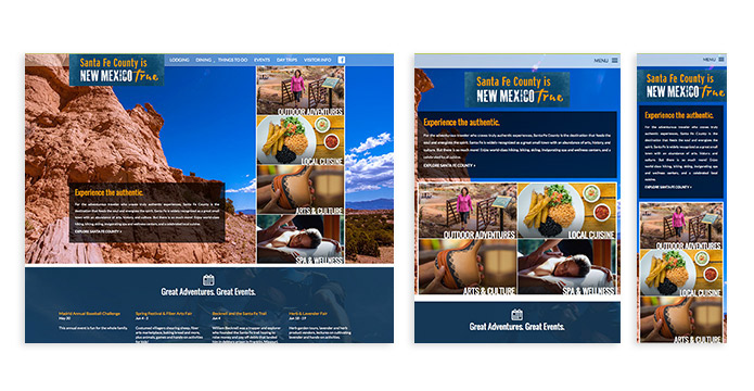 Desert Elements designed a new website all about things to do and see as well as where to stay and eat in our much loved Santa Fe County. The Santa Fe County tourism website offers visitor info on accommodations, dining, events, day trips, and more. It is optimized for mobile devices and for high definition displays. The page content and events are easily kept up-to-date with our responsive CMS. Most of all, the custom design entices locals and visitors alike to explore more of the adventurous and truly Santa Fe County has to offer.