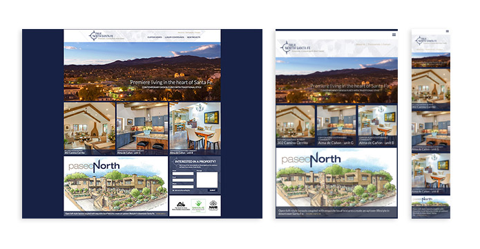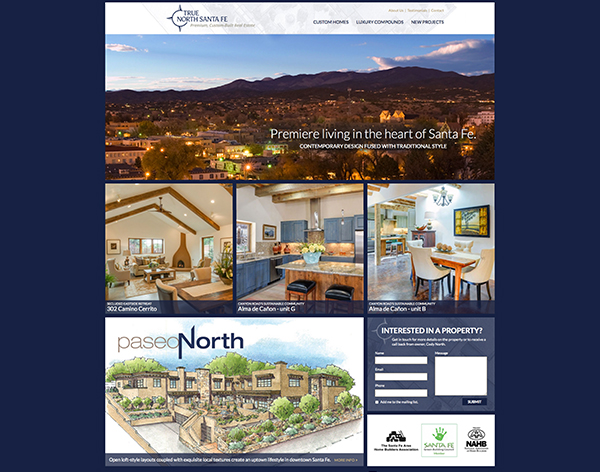 The True North Santa Fe website showcases the custom homes and luxury compounds built by True North Santa Fe. Each category of homes has its own large header image and each individual property has its own large image along with a gallery of photos and illustrations of the property. All of this content is kept robust and up-to-date via a simple, custom Content Management System (CMS). The responsive website is optimized for all screen resolutions and the prominent contact forms appear throughout the website to invite potential buyers to contact the company owner directly.