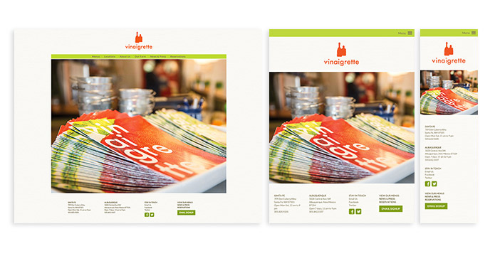 Desert Elements designed a custom restaurant website for Vinaigrette, with locations in Santa Fe, Albuquerque, and Austin. The website menus are kept up-to-date by staff using a simple Content Management System. Website visitors can make reservations online and view the address and directions via maps embedded on the site pages.