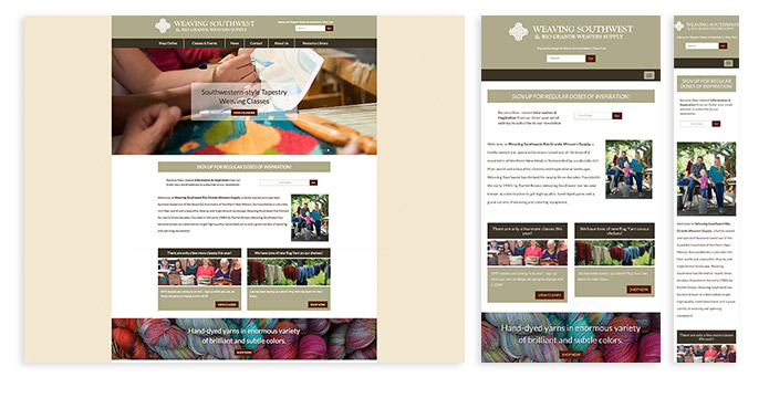 The Weaving Southwest website serves retail customers, class participants, online shoppers, and the community of weavers both locally and across the world. The website design and blog are mobile-friendly. Ecommerce functionality is the widely-used, robust Shopify platform.