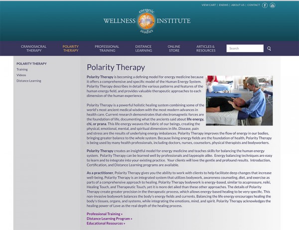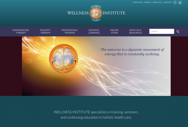 The Wellness Institute website, created by Santa Fe web designer Desert Elements, offers resources for students and practitioners of craniosacral and polarity therapy. The ecommerce website offers product sales and online training registration for workshops around the world as well as distance learning courses. Content includes training videos, articles, and a searchable practitioner directory.