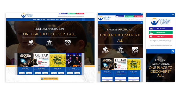 The Whitaker Center for Science and the Arts offers a wide variety of events and services to the community of Harrisburg, Pennsylvania and to tourists. The Whitaker has movies, live performances, and science exhibits as well as summer camps for kids and resources for educators. To create a clean, easy-to-use website for a diverse set of target audiences was a challenge Desert Elements enjoyed! The responsive website supports Retina display and integrates third-party services for ticketing as well as online donations and registrations.